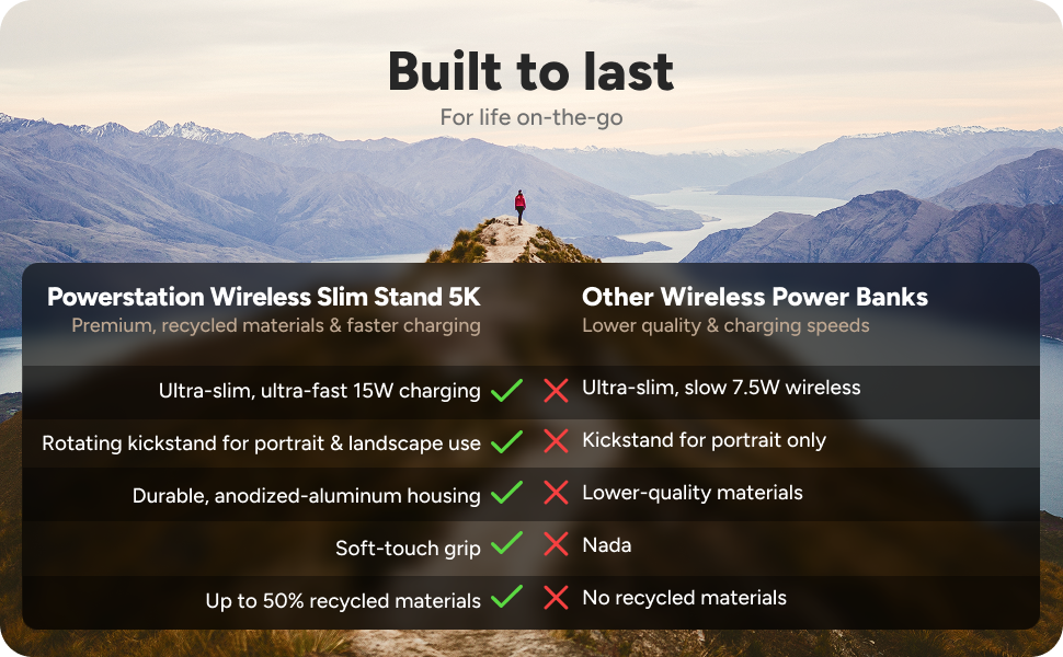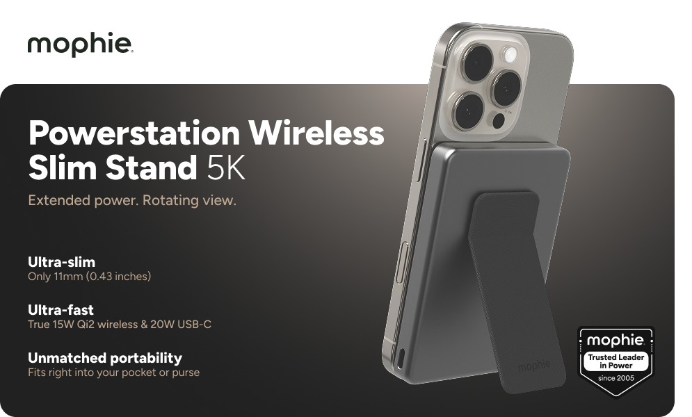 Stay powered throughout your day with the ultra-slim Powerstation Wireless Slim. With a 5,000mAh internal battery, Qi2-certified wireless charging, and fast USB-C PD output, this compact power bank delivers reliable performance in a sleek, sustainable design. It’s airline-approved and backed by a 2-year warranty for peace of mind wherever you go. Also available without a stand.